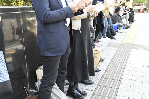 日本で最も警戒の厳しい権力中枢前でこの光景。カメラのフレームには入らないが、数えると35人もが本を読んでいた。=25日、官邸前 撮影:田中龍作=