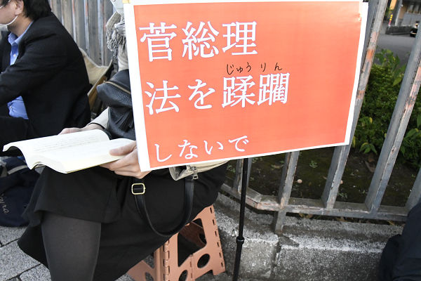 「蹂躙」にルビをふっているところが、権力への静かな抵抗だ。=25日、官邸前 撮影:田中龍作=