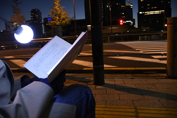 LED電球の灯りで本を読む男性。官邸前での読書時間は1日3時間から7時間に及ぶ。=25日、撮影:田中龍作=